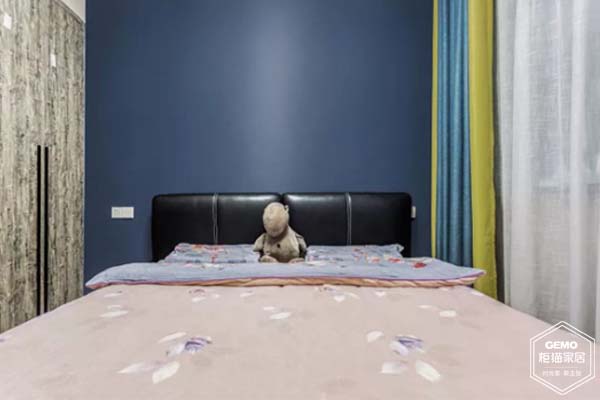 在風格上延續(xù)了客餐廳的風格,墻面選擇了藍色,打破了臥室單調(diào)的氣氛,擁有溫度的雙人床,軟綿綿的床品,似乎主臥室只有這張床可以解決所有的疲憊。