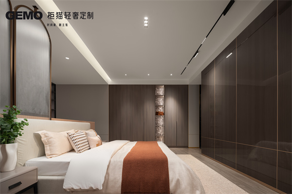 臥室對不同功能分區作有序規劃,集收納、梳妝、休息于一體。開放式鋁木衣帽間設計新潮,利用金屬鋁框的冷硬和木質的溫潤調性打造豐富立體的視覺效果。背板采用獨特的絨花點綴,碰撞出極具個性的雅奢情調。通頂衣柜則以流暢的線性勾勒構筑時尚摩登的高級氣場,入夜華燈初上,在這里點燃一支香熏,盡享身心放松的舒適體驗。